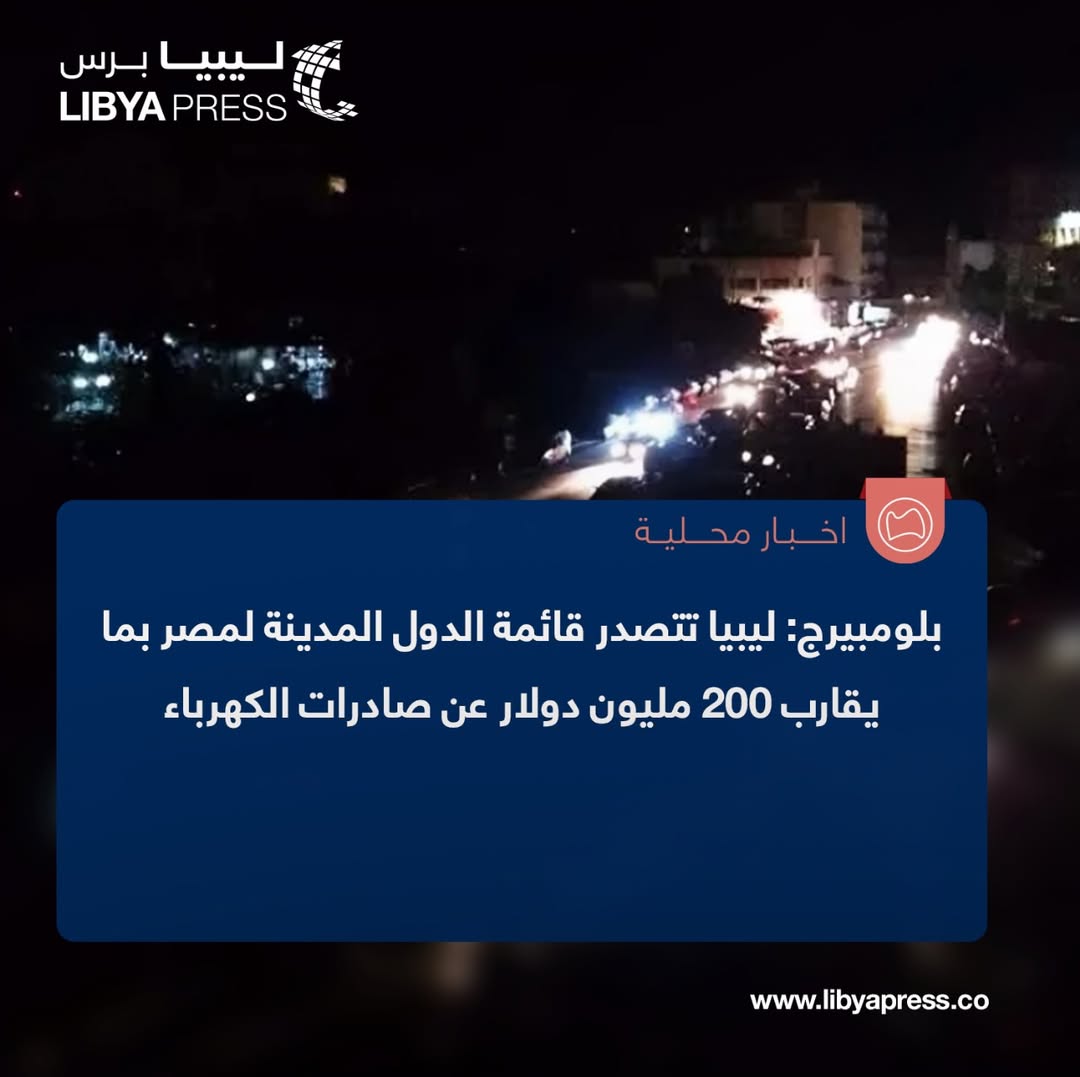وكالة “بلومبيرج” الأمريكية: ليبيا تتصدر قائمة الدول المدينة لمصر بما يقارب 200 مليون دولار عن صادرات الكهرباء.