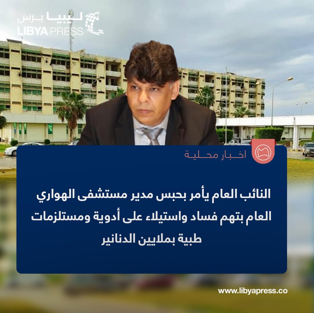 النائب العام، الصديق الصور، يأمر بحبس مدير مستشفى الهواري العام، بتهم فساد واستيلاء على أدوية ومستلزمات طبية بملايين الدنانير.