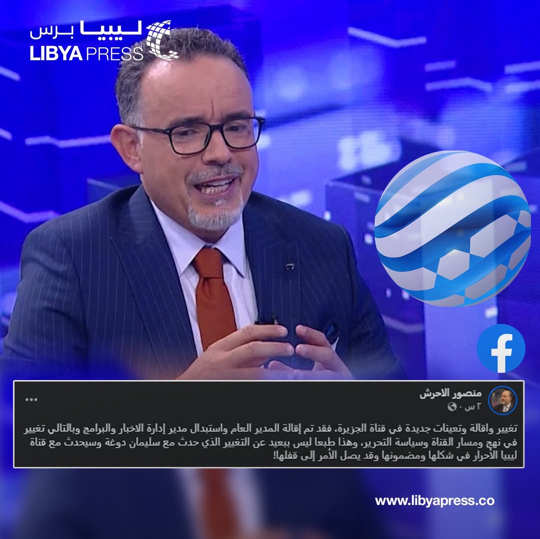 نقيب الصحفيين، منصور الأحرش: التغييرات في قناة الجزيرة، ليست ببعيدة عن التغيير الذي حدث مع سليمان دوغة، وسيحدث مع قناة ليبيا الأحرار، وقد يصل الأمر إلى قفلها!. #ليبيا_برس