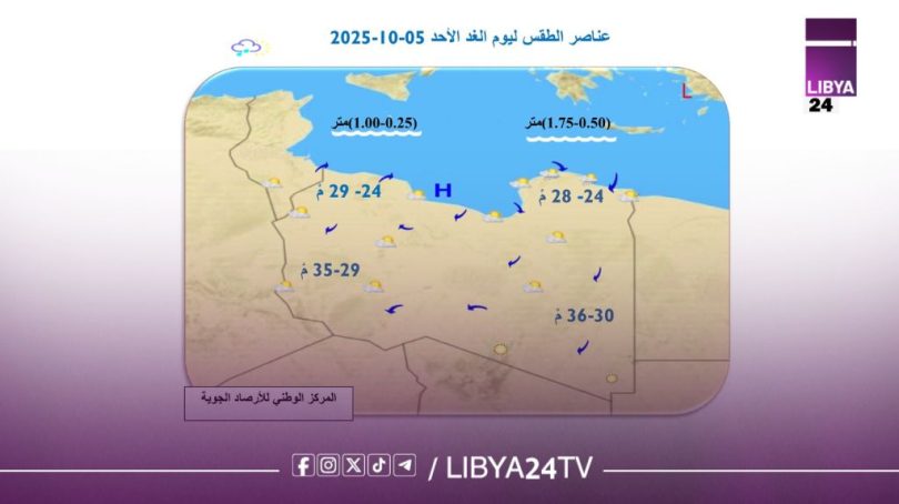 المنطقة الممتدة من رأس جدير حتى سرت – سهل الجفارة – جبل نفوسة ستشهد سحبا متفرقة هذا اليوم مع احتمال سقوط أمطار على بعض المناطق الساحلية، تنقشع مؤقتاً مساءً ثم تعود يوم الإثنين على ان تكون الرياح شمالية غربية إلى متغيرة الاتجاه، خفيفة إلى معتدلة وتكون الحرارة القصوى بين 22 و28 درجة مئوية، ترتفع قليلاً الأحد ثم تنخفض الإثنين.