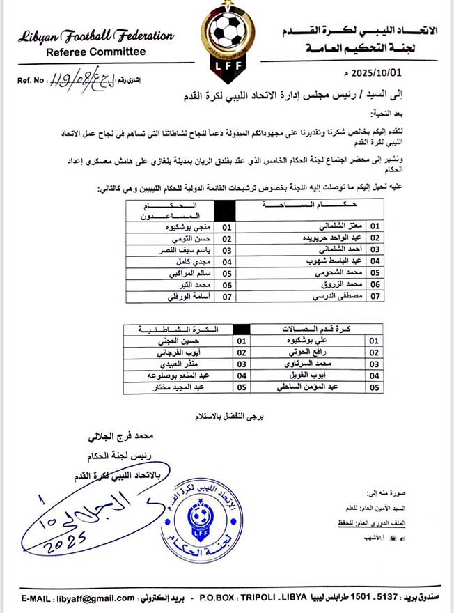 طرابلس 3 اكتوبر 2025 (وال)- اعتمدت لجنة التحكيم العامة بالاتحاد العام لكرة القدم قائمة حكام كرة القدم للشارة الدولية للموسم الرياضي 2025-2026 والتي ضمت 7 حكام ساحة – معتز الشلماني – عبدالواحد حريويده – أحمد الشلماني – عبدالباسط شهوب – محمد الشحومي – محمد الزروق – مصطفى الدرسي .