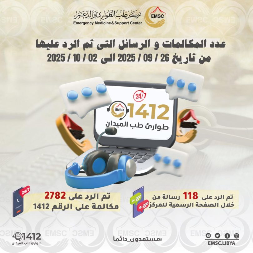 طرابلس، 3 أكتوبر 2025 (وال) – أعلن مركز طب الطوارئ والدعم، اليوم الجمعة، عن استقباله والتعامل مع 2782 مكالمة طارئة عبر الرقم المجاني 1412، وذلك ضمن الإحصائية الأسبوعية لغرفة الطوارئ خلال الفترة من 26 سبتمبر إلى 2 أكتوبر 2025.